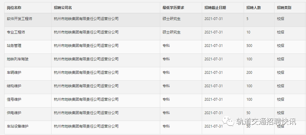 根據(jù)杭州市軌道交通建設(shè)及發(fā)展需要,為保障人員籌備工作順利開展,計劃來我校開展2021屆校園招聘工作工作,此次機會十分難得,希望未就業(yè)學(xué)生充分了解企業(yè),把握機會,踴躍報名!