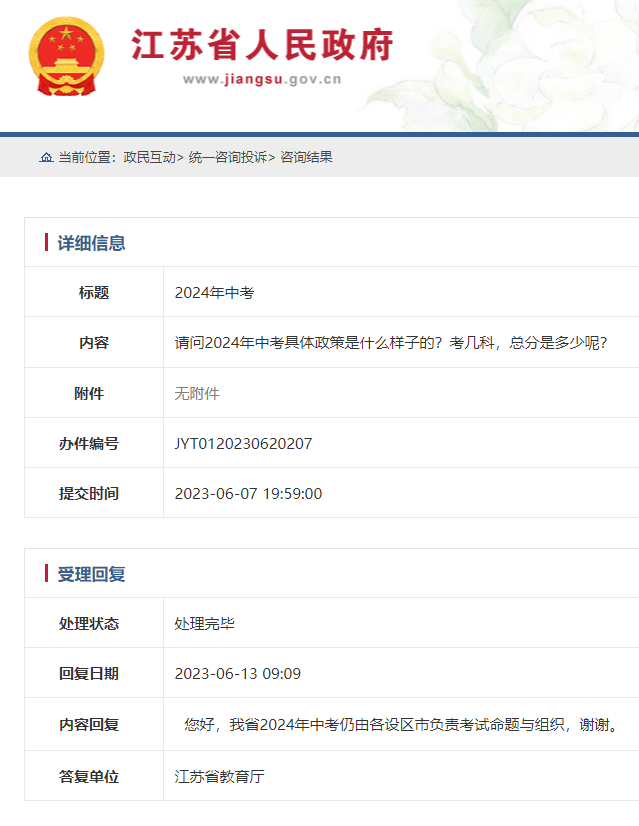 此前,有熱心家長(zhǎng)在江蘇省教育廳網(wǎng)站上咨詢:江蘇是否會(huì)在2024年全省統(tǒng)一中考,官方也給出了明確回復(fù):我省2024年中考仍由各設(shè)區(qū)負(fù)責(zé)考試命題和組織。